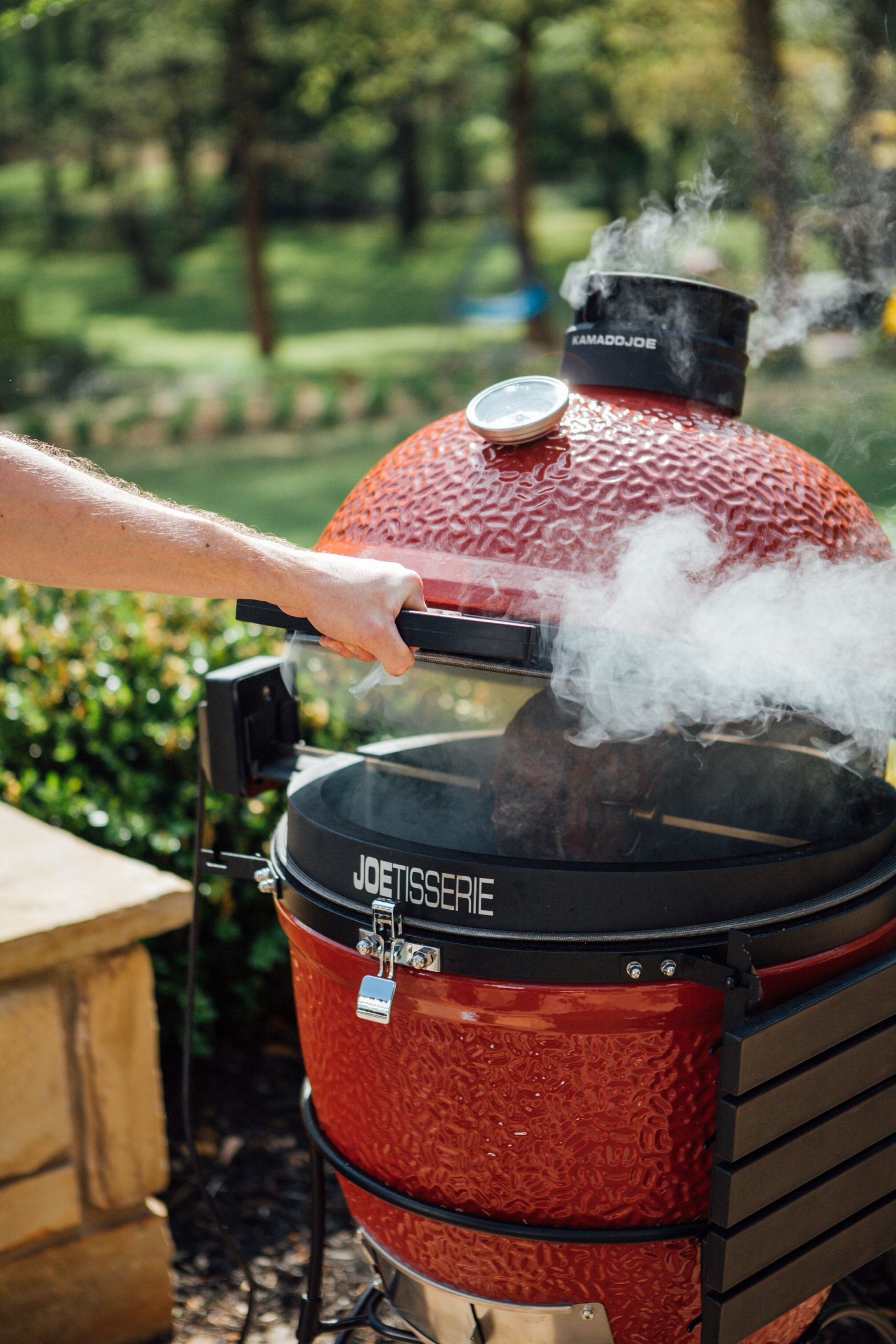 Rustidor Kamado Joe en una nueva forma de cocer tipo rustido, aprovechando el cuerpo cerámico de alto fuego característico del Kamado Joe para carnes ahumadas, jugosas y tiernas. Con un motor silencioso pero potente de 220 voltios que puede girar hasta 20 kilos. de pollo, costilla o culata de Boston, la innovadora Joe Tisserie presenta una forma de cuña distintiva para que los cocineros puedan sellar la cúpula del kamado para una retención óptima del calor. La barra de asador duradera es fácil de instalar y presenta horquillas rápidamente ajustables para un excelente equilibrio, la rotación constante conserva los jugos naturales de la carne para una cocción uniforme. Esto se ajusta al Kamado Joe clásico.